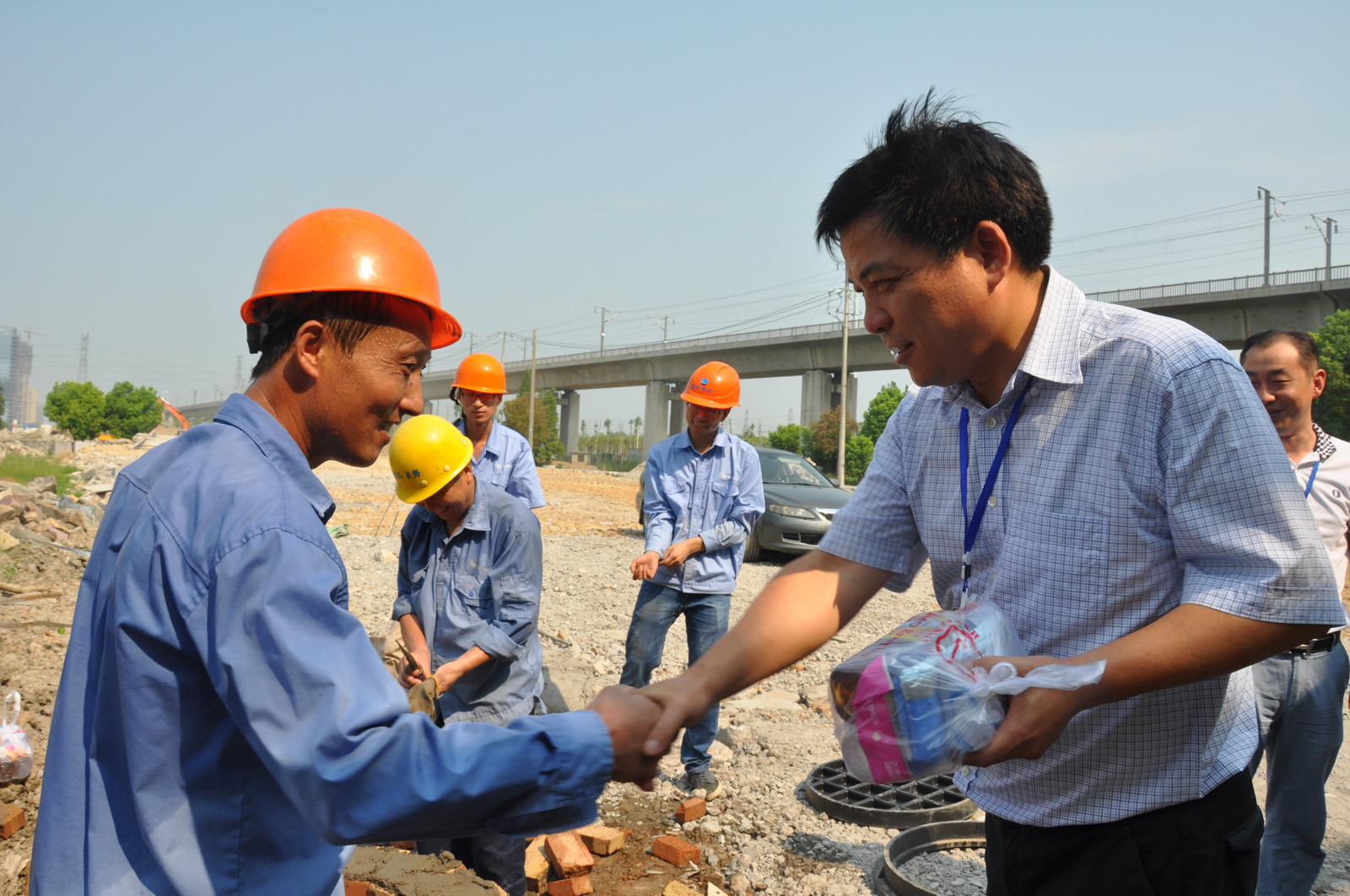 月27日上午,集團(tuán)公司董事長周儉在公司董事長谷連森、總經(jīng)理李葉茂等領(lǐng)導(dǎo)的陪同下,前往柯橋城區(qū)金昌誠園小區(qū)和興華路與鏡水路交叉口配套工程施工現(xiàn)場,慰問堅守崗位的一線職工,為他們送上了消暑飲料及毛巾等防暑用品,并叮囑大家在高溫酷暑下盡量錯時作業(yè),注意做好防暑措施。